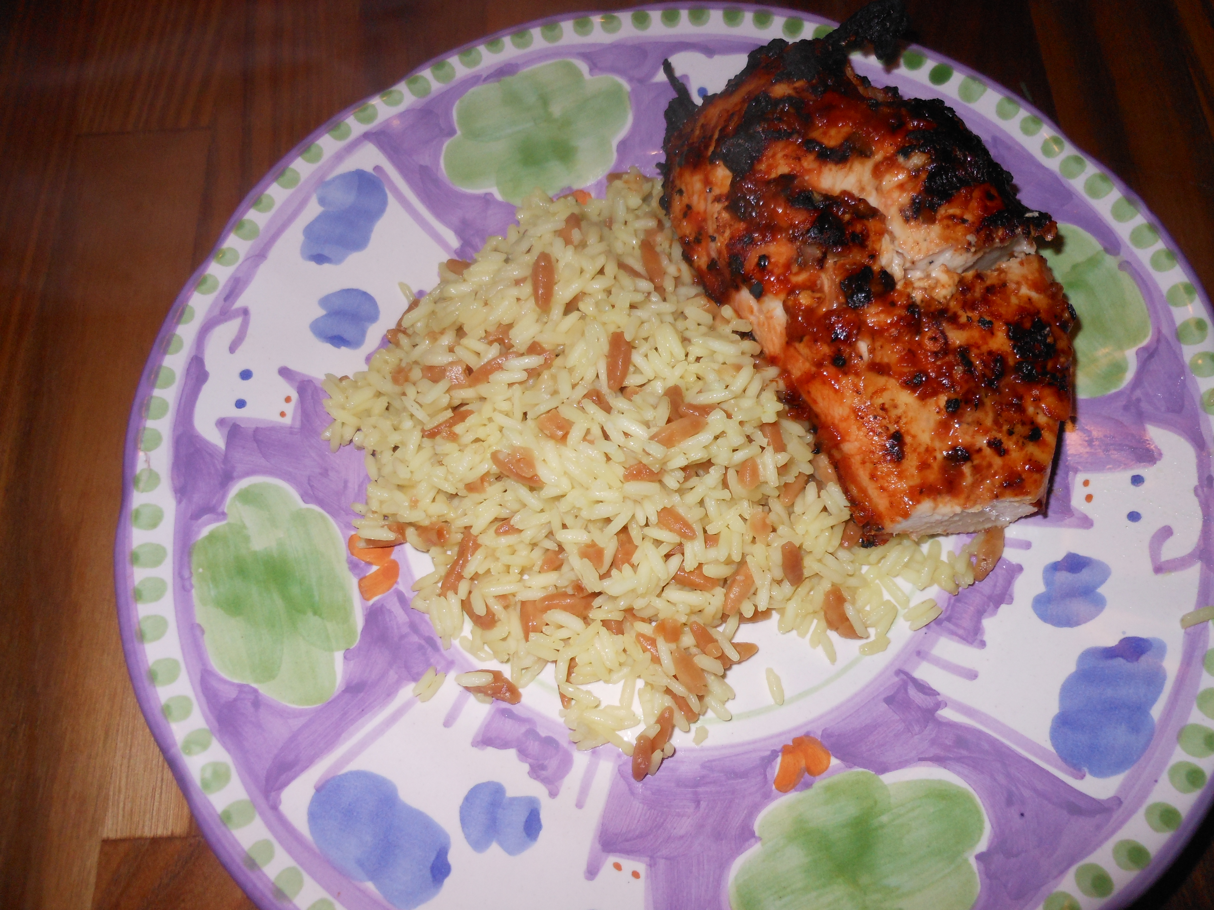 Prepare grill on high heat. Grill chicken until almost cooked through (about five minutes per side). Using a silicon brush, brush the remaining marinade on both sides of chicken while on the grill. Continue grilling until done–glazed and cooked through (about 3 minutes more per side). I had to cut into the chicken to check that it was cooked through (I used pretty thick pieces). Just slice crosswise and serve with extra sauce on the side. I served over rice and with cold corn soup.