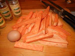 Today didn’t clear up until late and I decided to go on a hike. As I was hiking, it felt like fall in the air and I decided to roast a chicken (see recipe under Roast Chicken) and make my baked sweet potato fries with tzatziki sauce. This sauce is so fresh and flavorful on fries and is absolutely delish on chicken and lamb,as well. Lamb is a bit heavy for now, though, so that recipe will have to wait. Joel and I like our fries spicy so you should adjust the hot seasonings to your liking. I used hot curry powder but regular curry powder works just as well. These fries have a distinct, tasty Indian flavor, thanks to the curry, turmeric and cumin. I hope you enjoy this different take on a sweet potato. This is the second time I am posting this recipe because it sort of got lost in the vegetables last time and it deserves its own page.