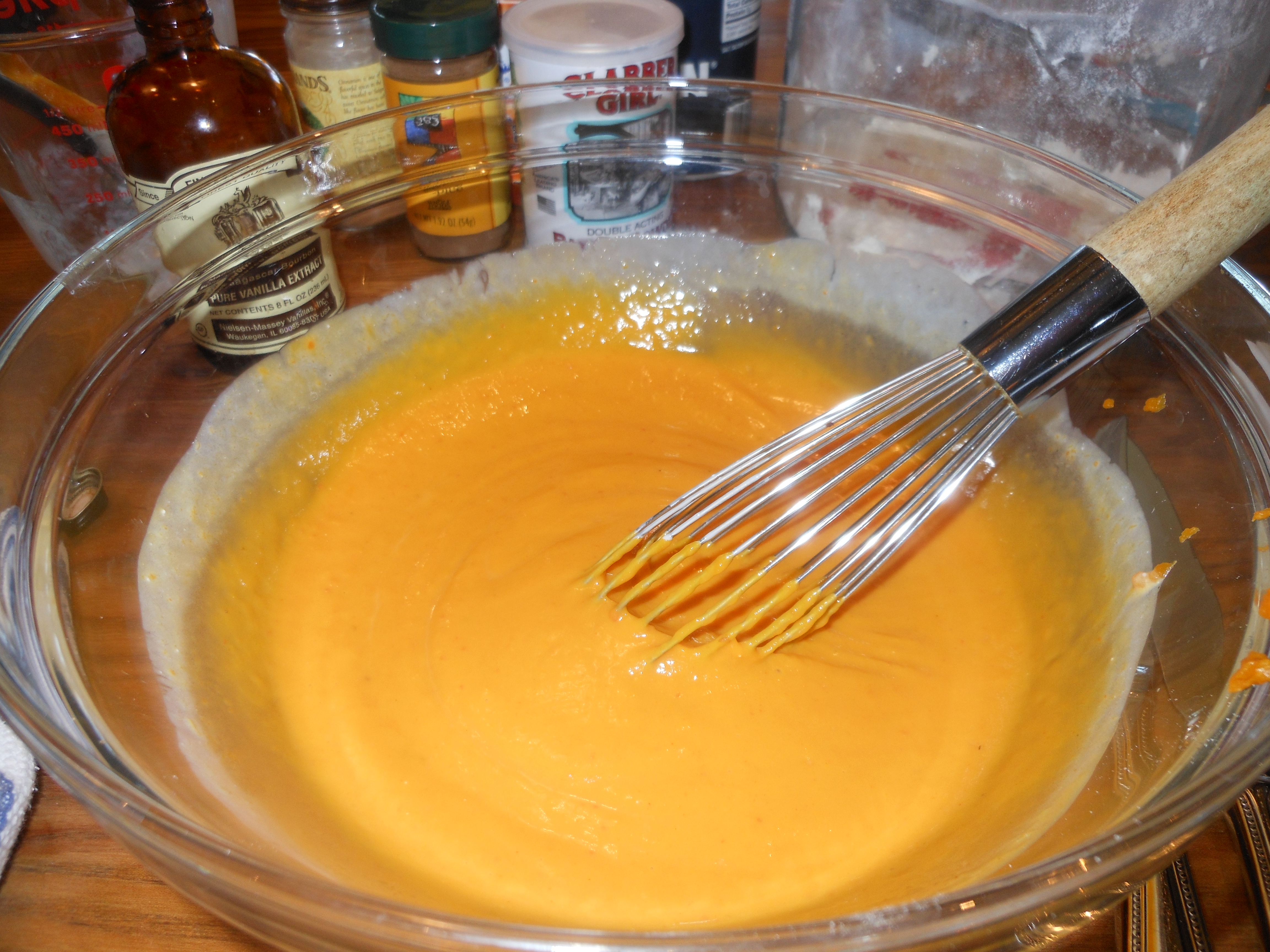 Preheat the oven to 350 degrees. I mixed all dry ingredients together then mixed in eggs ( one at a time) and can of pumpkin and vegetable oil. Mix till combined, don’t overmix. No need to sift, just put dry ingredients in a bowl first and whisk together with a whisk , get some air in there.