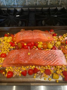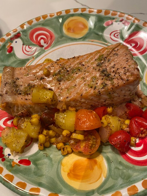 I happen to love Salmon, I find it’s nutritious , tasty and so very versatile. Yesterday I posted one of my favorite air fryer recipes for salmon . There are countless ways to cook and serve salmon, and they’re all delicious but I really love one pan meals so you can cook in one pan along with vegetables. The combination of flavors in this recipe is amazing. The sweetness of the corn and yummy mouth bursting cherry tomatoes is perfection!