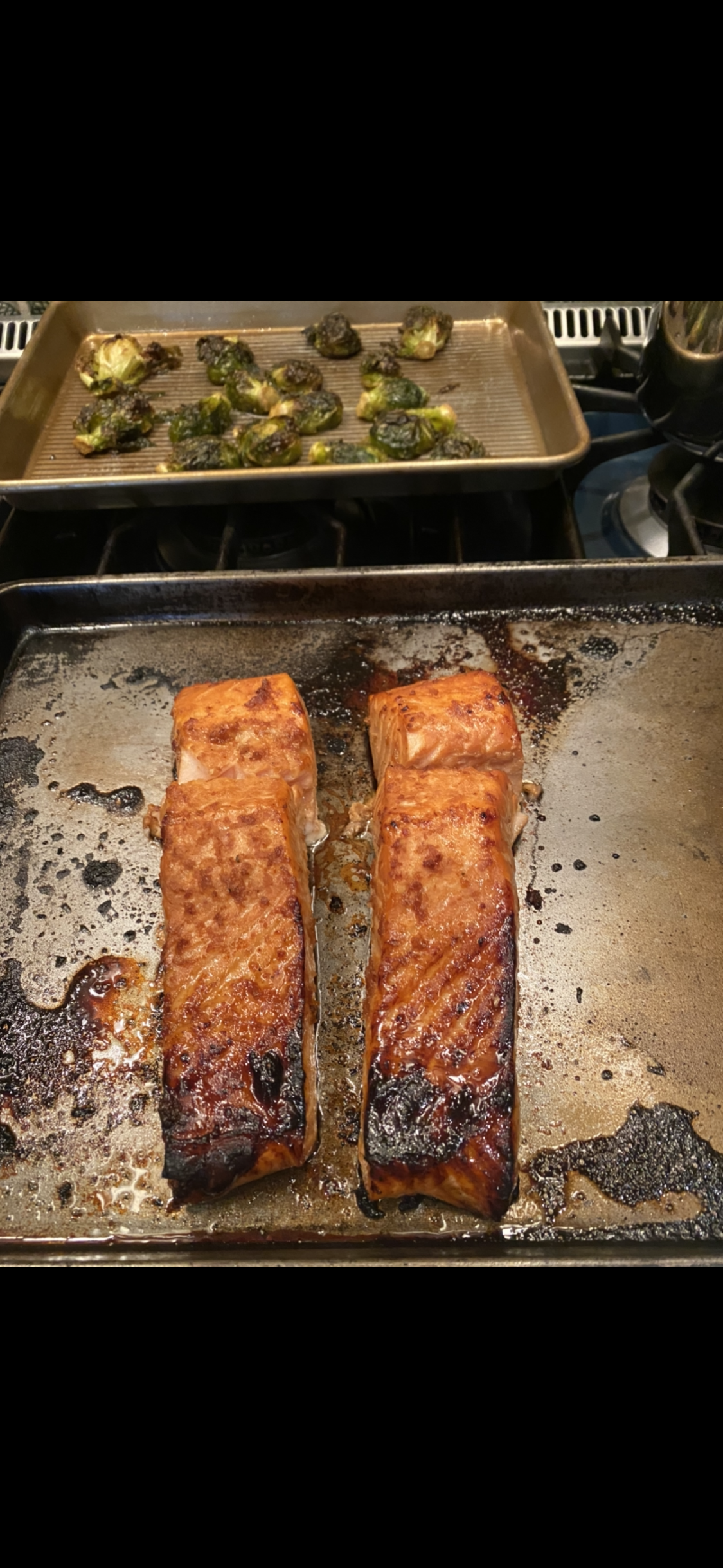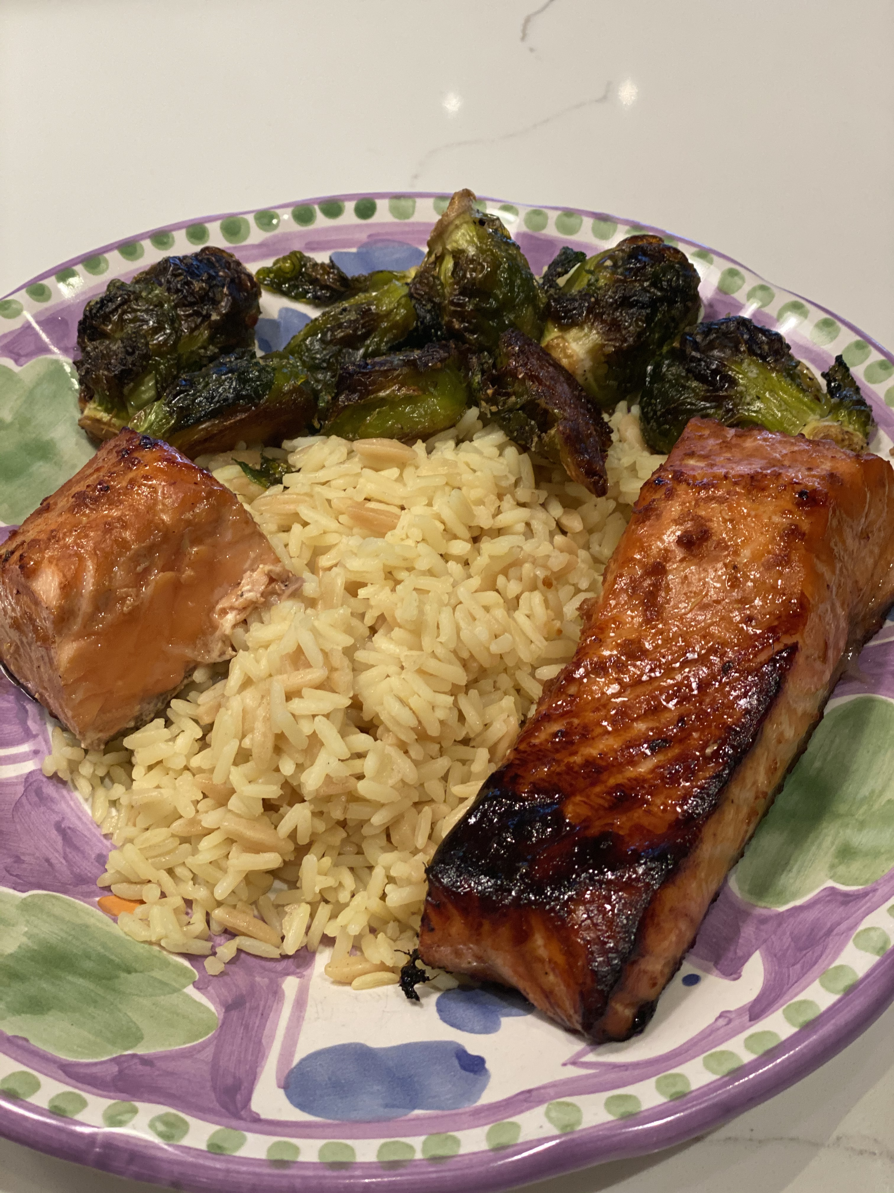 Simple ingredients and Delicious Results I have been making this salmon recipe forever — Joel loves it and so do I. 4 easily obtainable ingredients and you have a delicious meal . Salmon, brown sugar, dijon mustard and Salt and Pepper. Give it a try over rice or potatoes and whatever green vegetables your family eats . Enjoy!
