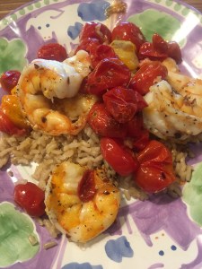 Roast until the shrimp are opaque , start to curl up and turn pink, and tomatoes start to burst. I cooked for 15 minutes, but I had very large shrimp. You’ll have to adjust time for the size of your shrimp. Smaller shrimp could take 10-12 minutes. You can always cut into the middle of a shrimp to be sure it’s done.