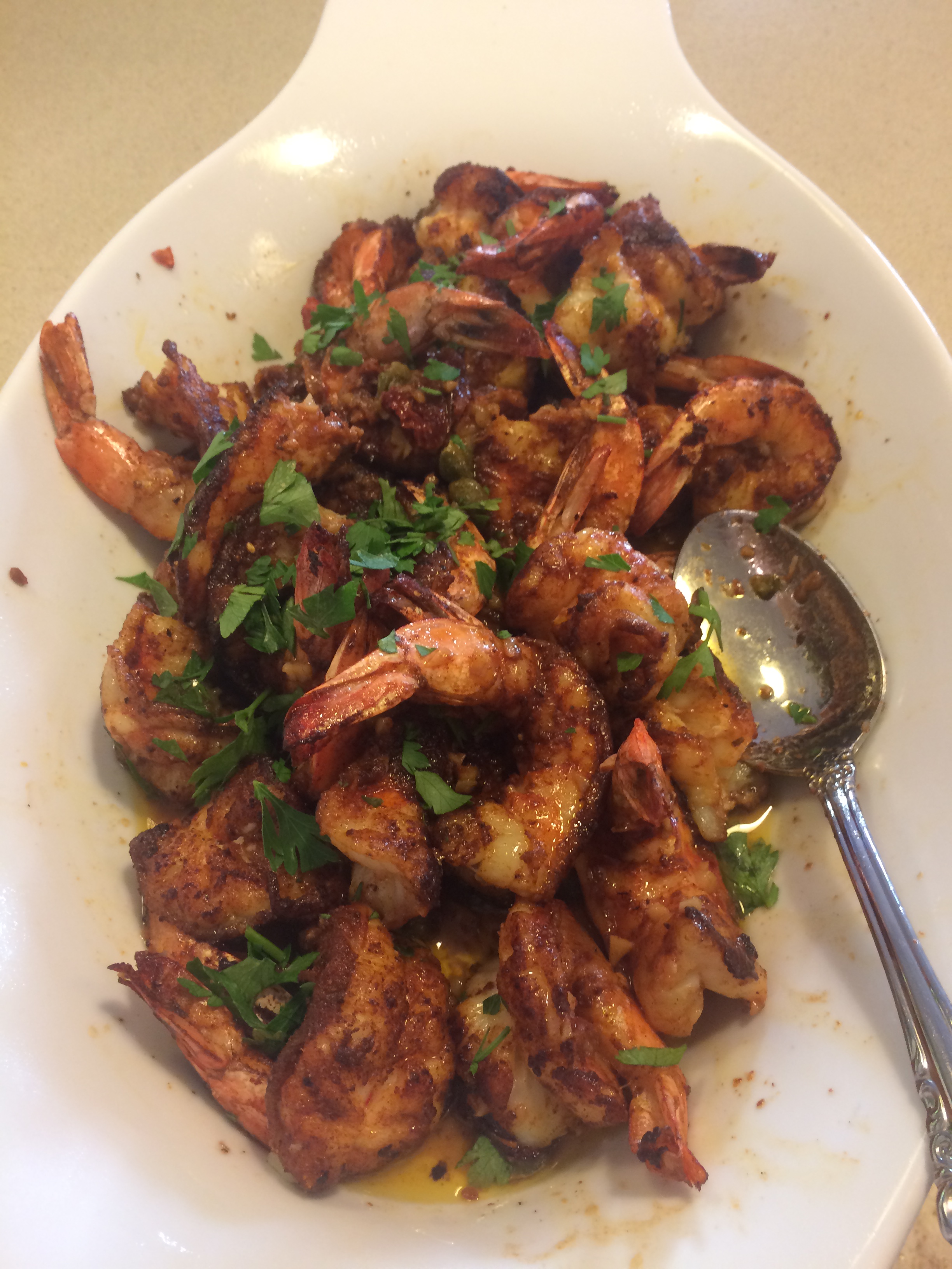 In the same skillet add 1 – 2 teaspoons of olive oil and add onions and saute until translucent and soft, about 5 minutes. Add the can of tomatoes with their juices, wine, garlic, and oregano. Simmer until the sauce starts to thicken up, about 15 minutes. If sauce sits for a while it may loose some of its liquid , you can just add a little bit of water at a time to get sauce where you’d like it, but just a little at a time. When you’re ready to serve, add the shrimp back into simmering sauce with any juices that they may have accumulated, toss to coat the shrimp, and cook for about 3 minutes . You can cut into a shrimp to make sure it’s cooked , it should be opaque not translucent. Stir in the parsley and basil. Taste for salt, and serve.