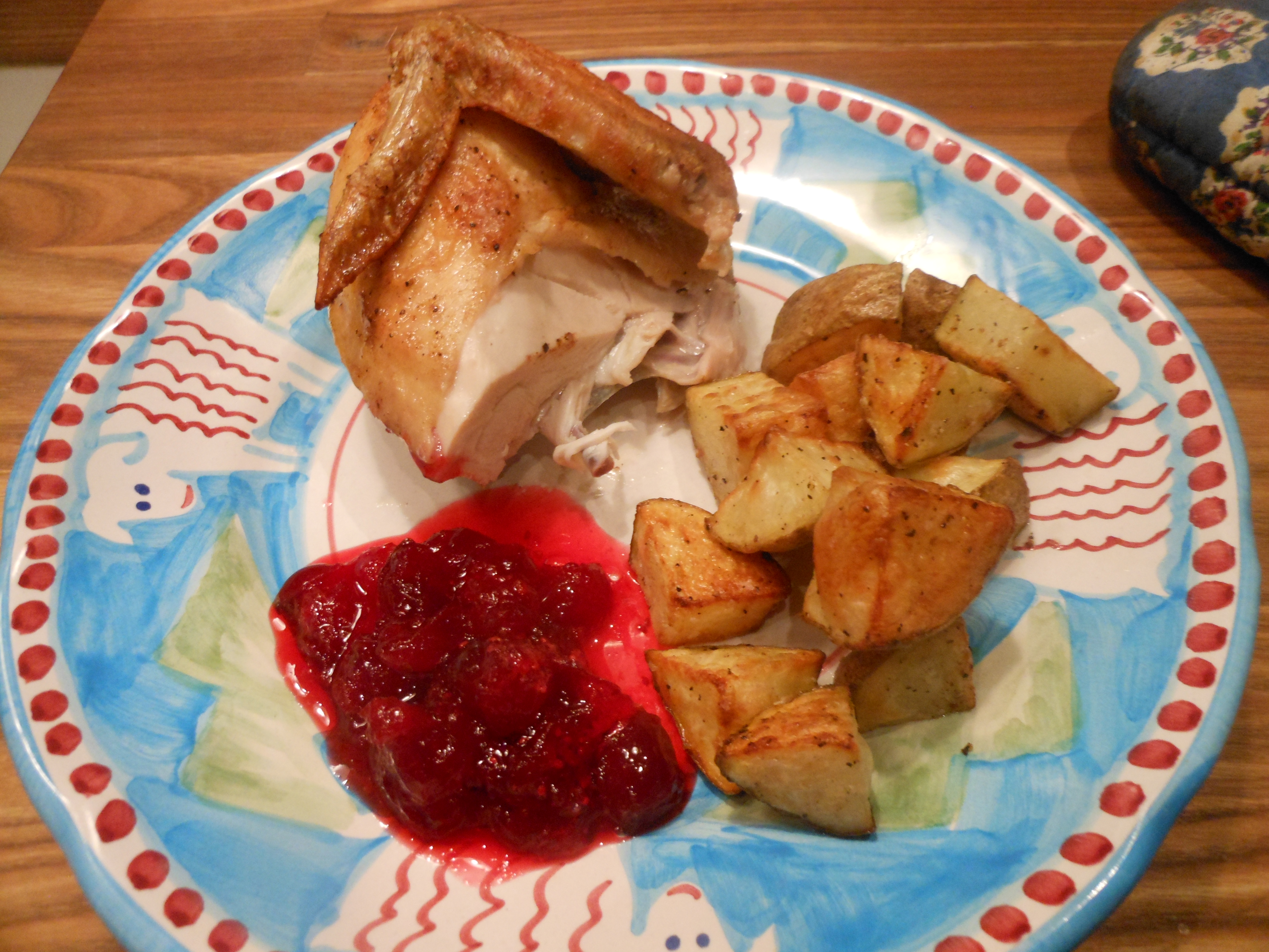 I have wanted to roast my chicken this way for quite some time, but always fall back on the standard. I have posted the standard way under Good Old  Roast Chicken.  You’ll need to remove the backbone of the chicken , and I am not that great with butchering so left it to the butcher in Whole Foods or whoever you go to. Just ask the butcher to remove backbone ( I discarded it or save it for making stock)  and cut chicken in 1/2. This removal of the backbone of the chicken is known as spatchcocking , simply put,  you roast the chicken in about 1/2 the time as conventional methods with the maximum crispiness to the skin, and very moist chicken is achieved.  I used my more shallow Le Creuset pan and chicken fit snugly in which is what you want. You don’t want it in too big a pan, just make sure your pan is flame proof , a 12 inch cast iron skillet is also perfect.  This is really easy, and I must give credit where credit is due, I got my inspiration from the Zuni Cafe Cookbook. I changed it a bit by cutting the chicken in 1/2 but used the times it posted and it was sheer perfection.  Crispy and moist! Served with fresh cranberry sauce and roasted potatoes.  You’ll have to turn your exhaust fans on for this one . By the way did I mention prep to table in an hour???