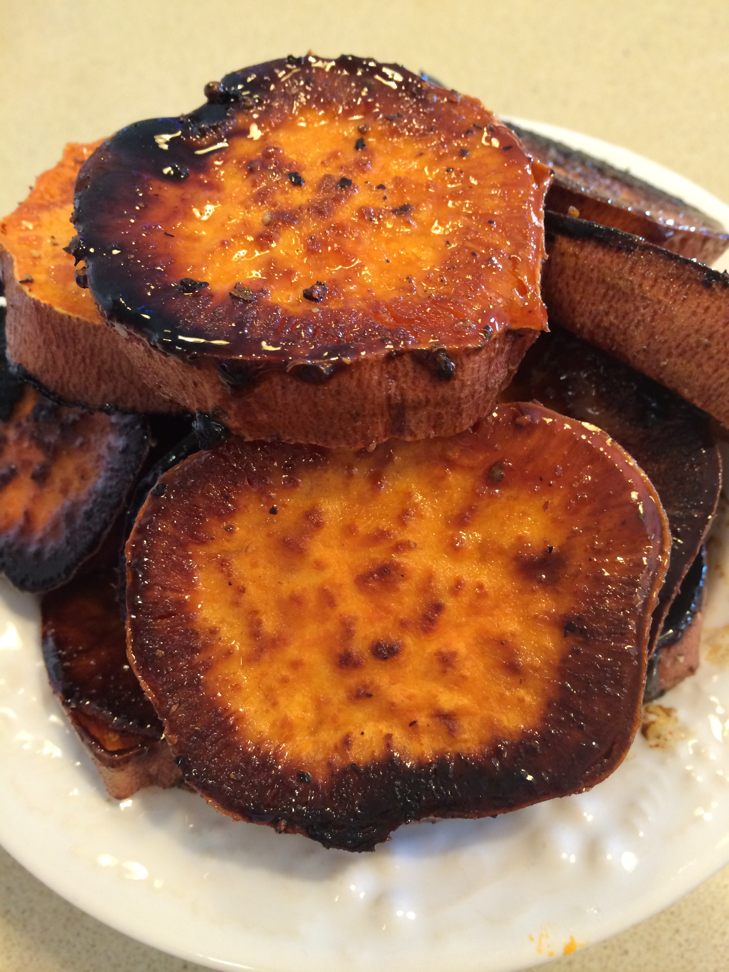 Transfer mixture to a 2 1/2 quart oval casserole dish, smooth out on top. If you want to make a checkerboard top, start at the top left, and alternate one marshmallow with 2 pecan halves until the entire casserole is covered. Bake at 350 degrees for about 30 minutes or until marshmallows are browned and puffed. If you don’t feel like doing the checkerboard, you can also sprinkle mini marshmallows on top, or some large ones. Whatever you like. This is pretty loose, but you gotta have marshmallows!