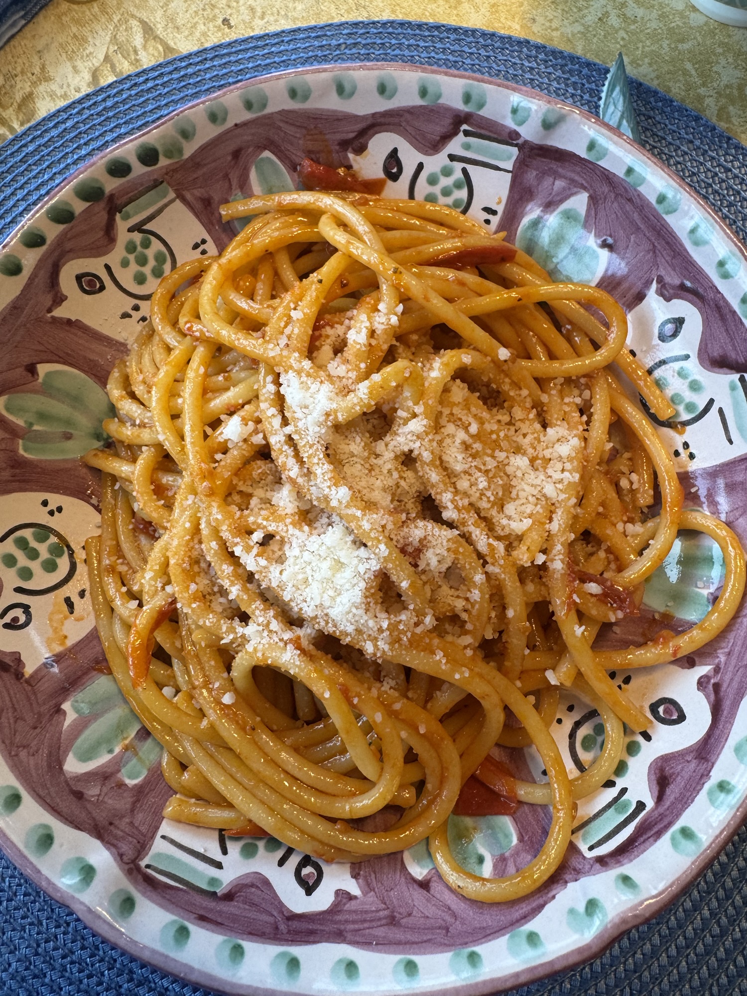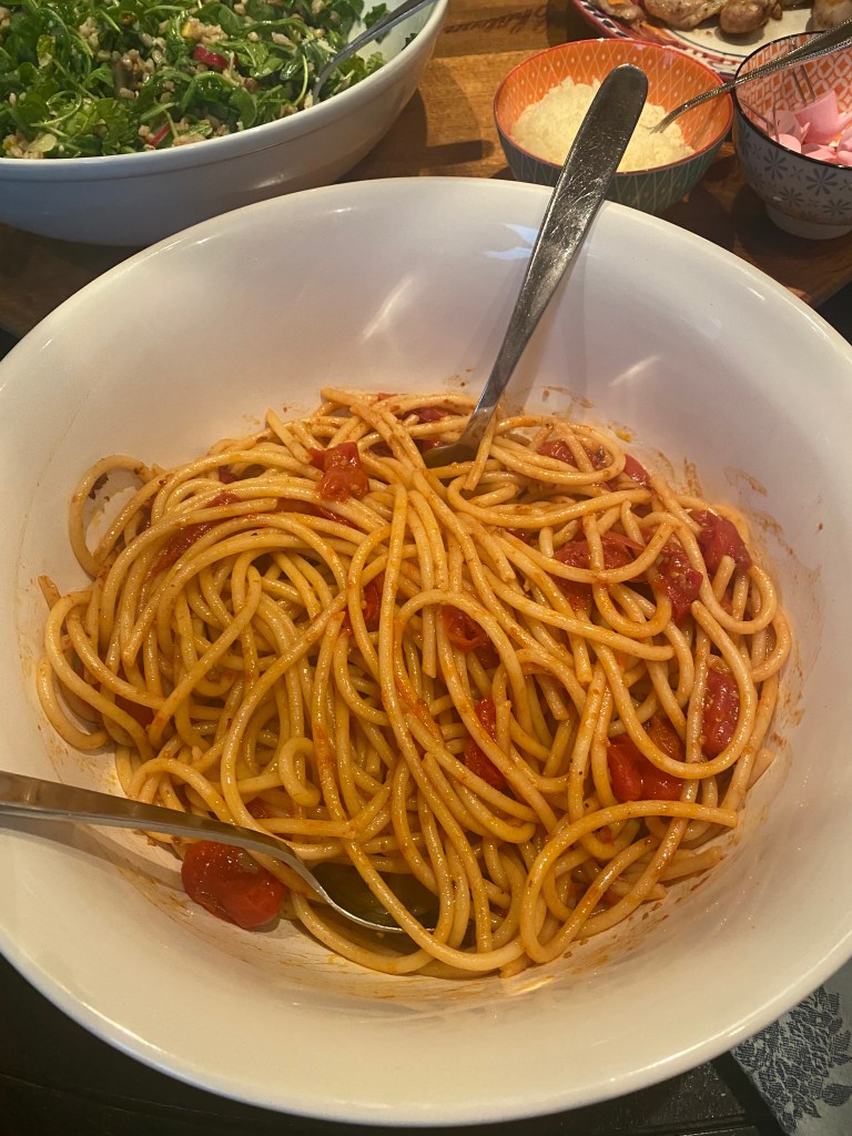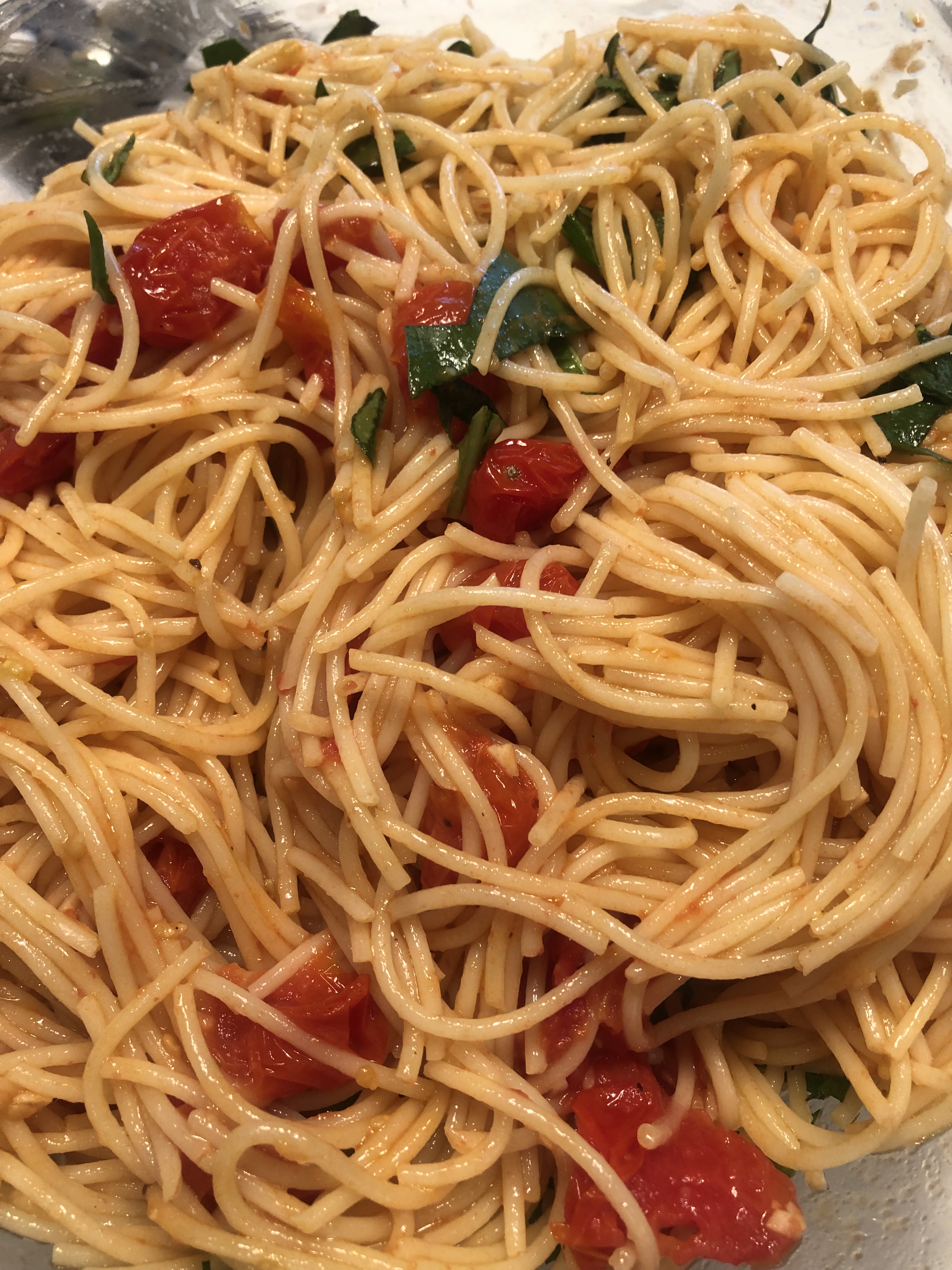 Once the spaghetti is cooked and you’ve drained it ( remember to reserve a cup of pasta water). Add the pasta water a little at a time to the pan with tomatoes and over medium-low heat toss the pasta with the tomatoes well. Add the basil . I let everyone add their own cheese at the table.