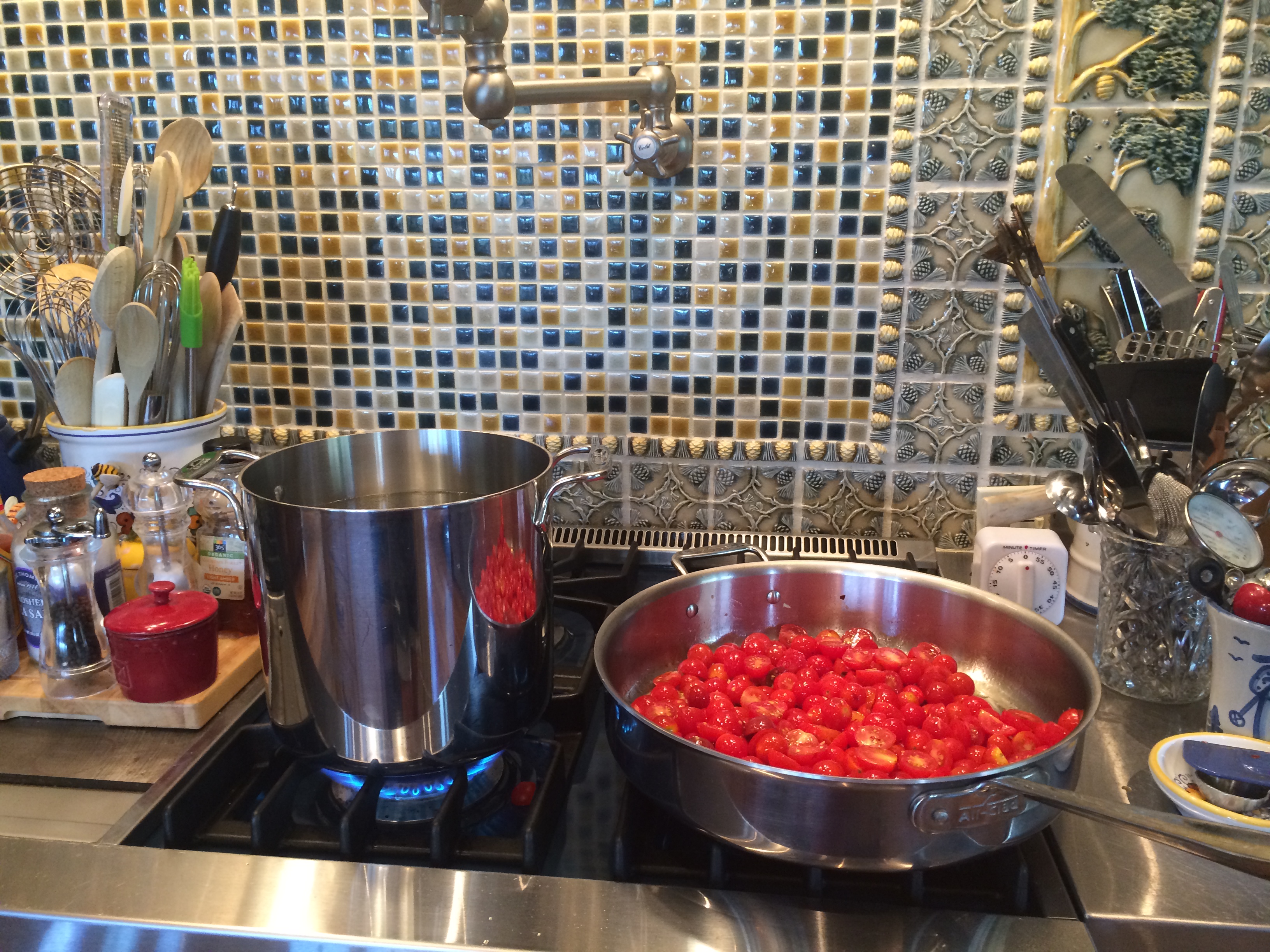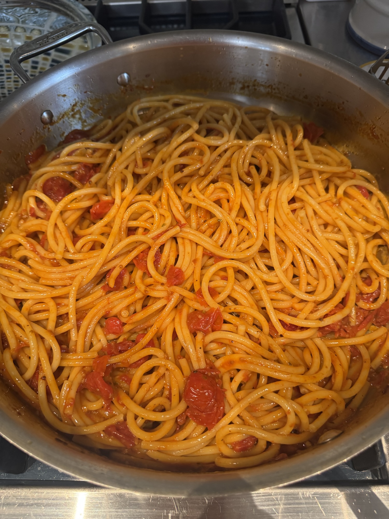 Heat a large sauté pan over medium heat add 4 tablespoons of olive oil and garlic, cook until garlic is golden about 2 minutes. Be careful you don’t want to burn this garlic. Add the crushed red pepper now and the tomatoes, and cook over medium low heat. I also added some kosher salt (about 1/2 teaspoon to start, you can always add more) and a little freshly ground black pepper. Stir for a while to make sure garlic doesn’t burn and tomatoes start to burst and deflate about 5 minutes and if you think you need a little more olive oil add it now . I let the tomatoes simmer in the pan for about 15 minutes to 1/2 hour for the best consistency. I smashed down stubborn little tomatoes at the end with the back of a wooden spoon or a masher if you have one. A very low simmer at the end. Taste for Salt and Pepper. The longer the tomatoes sit in the oil and cook down on a low simmer the better the sauce will be so if you have a little time let it sit. I think my tomatoes sat for at least 2 hours like this. Once tomatoes were cooked down I just turned off heat covered it and let it sit. Before eating while making the pasta I heated up on a low simmer.
